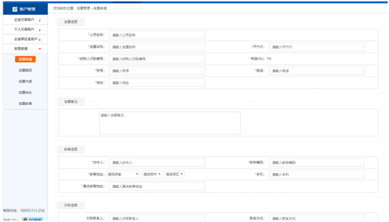 在達成物流交易后,點擊后臺界面上的“發票申請”按鈕進行開票信息的填寫,平臺將于次月5-25日進行發票的郵寄。(下圖為貨主企業進行發票信息填寫的頁面)