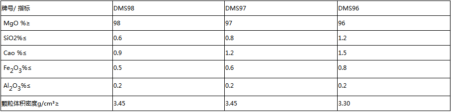 | 化學(xué)指標(biāo):Al2O3≤0.3%;CaO≤1.5%;Fe2O3≤0.9%;MgO≥96.0%;SiO2≤1.2%;SiO2≤0.7% |